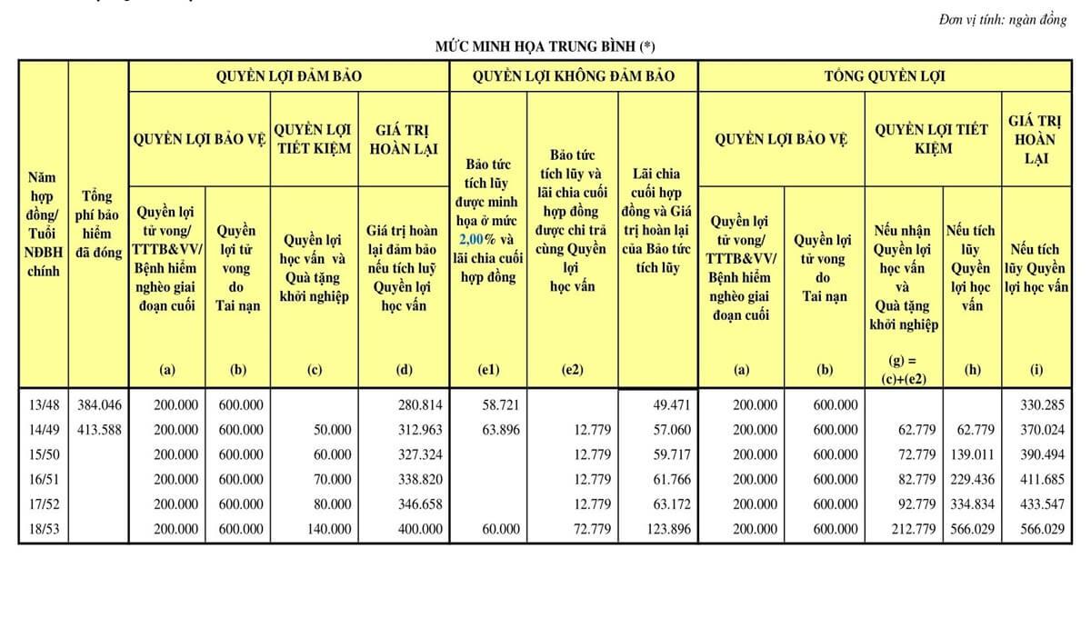 Bảng minh họa quyền lợi bảo hiểm giúp người tham gia hiểu được các quyền lợi như tử vong, bệnh lý nghiêm trọng, quà tặng khởi nghiệp... sẽ được chi trả như thế nào theo mức phí cần đóng. Tuy nhiên, các quyền lợi không đảm bảo như bảo tức, lãi chia cuối hợp hợp đồng, giá trị hoàn lại... chỉ mang tính chất tham khảo bởi còn phụ thuộc vào tình hình kinh doanh của công ty bảo hiểm.