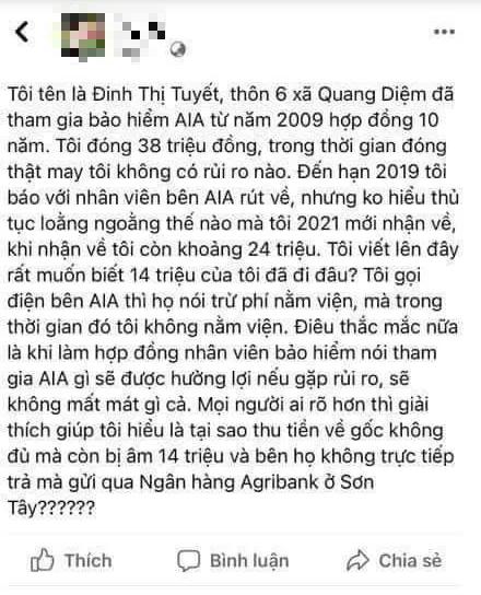 Vào ngày 22/5/2021, trên mạng xã hội facebook đăng bài chia sẻ về việc Công ty bảo hiểm AIA lừa đảo và rất nhanh chóng nội dung này trở thành chủ đề bàn tán của nhiều người và được chia sẻ rộng rãi.