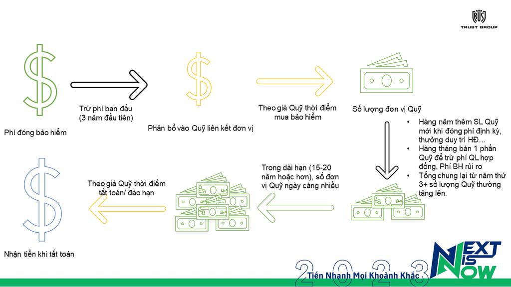 - Slide giải thích quy trình vận hành của đồng tiền khi mua bảo hiểm liên kết đơn vị ILP để hiểu bản chất sản phẩm bảo hiểm liên kết đầu tư Quỹ liên kết đơn vị.